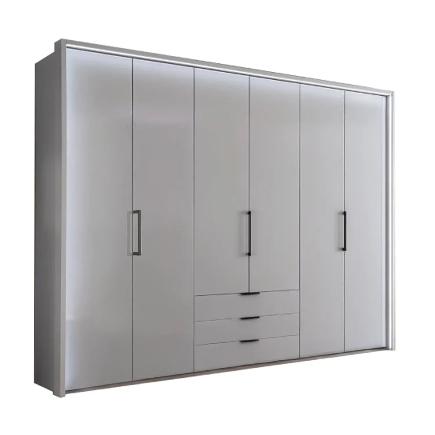 With an impressive 300cm width, this wardrobe offers exceptional storage capacity, making it ideal for larger bedrooms or shared spaces. It features six hinged doors and three soft-close drawers, allowing you to organise your clothing, shoes, and accessories effortlessly. The independent door design ensures easy access to different sections, making it convenient for multiple users. Thanks to adjustable shelves and hanging rails, you can customise the internal layout to suit your specific storage needs.