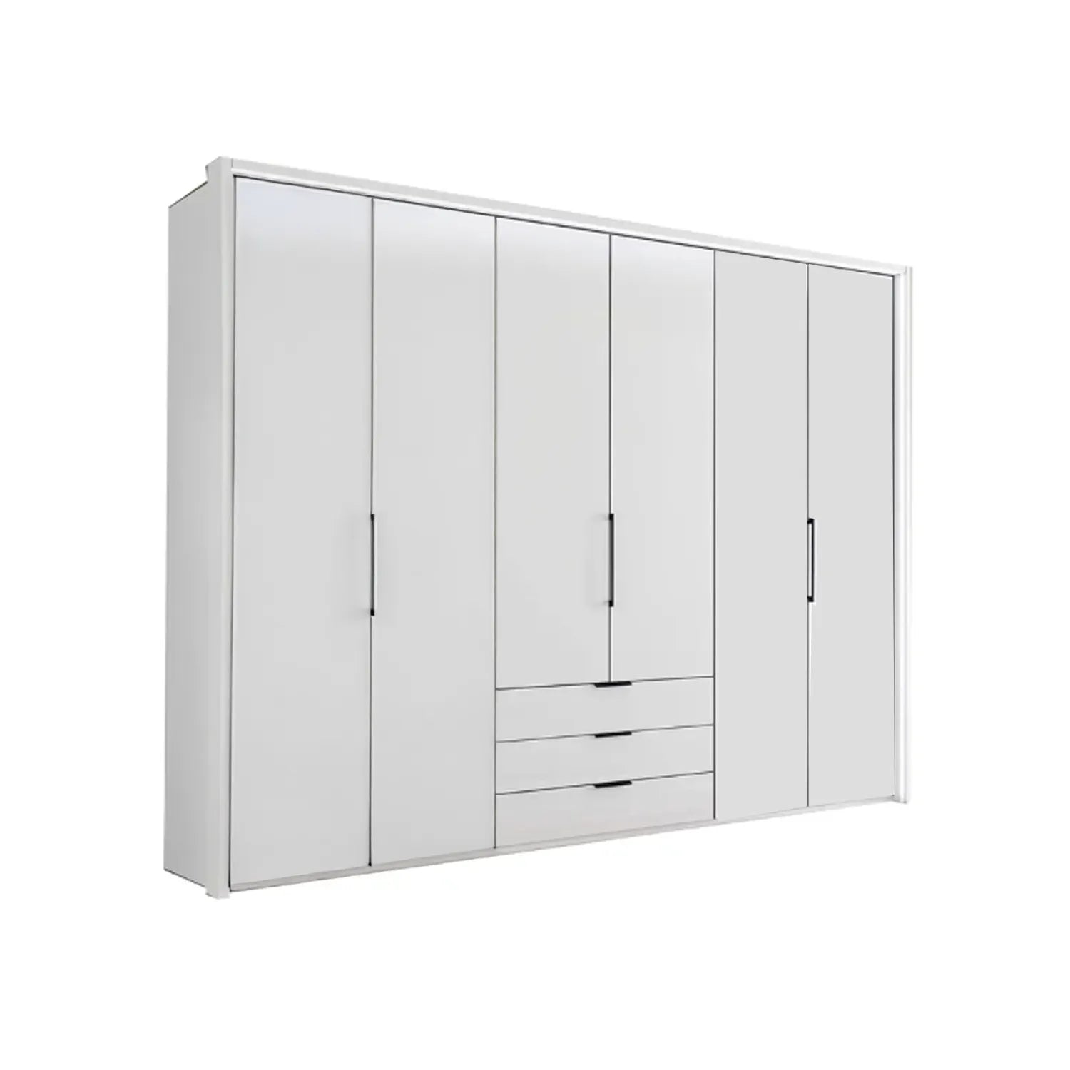 With six hinged doors and three smooth-gliding drawers, this wardrobe offers ample space to store clothing, accessories, and essentials. The soft-close drawers ensure a gentle and quiet closing motion, while the adjustable shelves and hanging rails allow for a fully customisable interior layout. Whether you’re sharing the wardrobe or using it for yourself, the independent doors make it easy to access your belongings without any hassle.