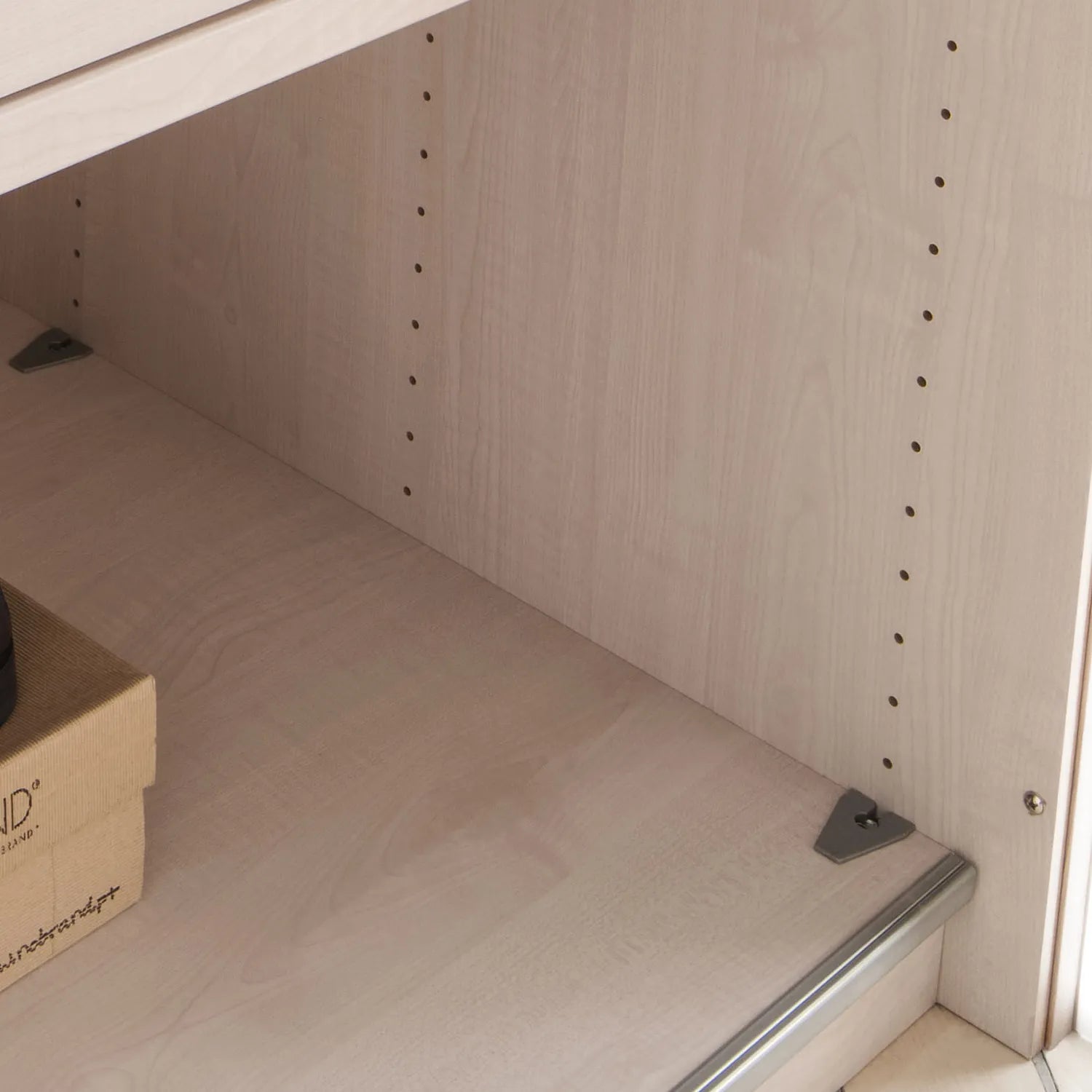 Behind the sleek sliding doors, the wardrobe is divided into intelligently proportioned compartments depending on the size selected. For example, the 200cm version contains two 96.4cm sections, while the 250cm and 300cm sizes provide additional compartment divisions for efficient organisation. Every section comes equipped with two 22mm thick adjustable shelves and a robust metal hanging rail that holds up to 60kg.
